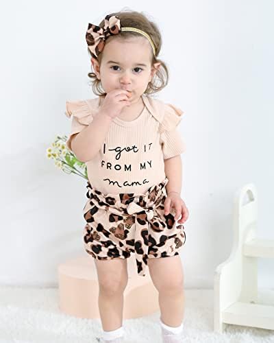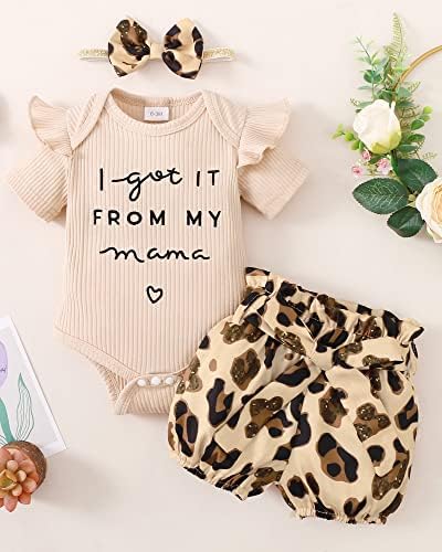 Cute Baby Girl Summer Clothes:Funny print on the front of ruffle-sleeve romper, pair with floral leopard pant and headbands. Cute 3 pieces outfits, make your baby more attractive and fashionable.