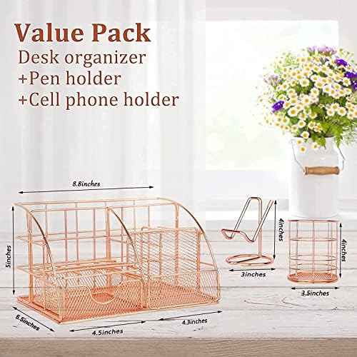 Rose Gold Desk Organizer: 8.8×5.5×5 Inches(L*W*H) Pen Holder: Diameter: 3.5 Inches, H: 3.9 Inches Cell Phone Holder Diameter: 2.7 Inches, H: 3.9 Inches All Weight: 27.6 Ounces(785 Grams) Material: Metal iron Color: Rose gold Package Included: 1Pcs Rose gold desk organizer with drawer +1Pcs Pen holder+1Pcs Phone holder