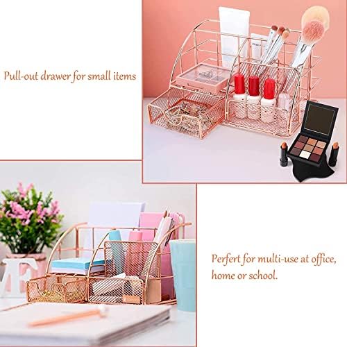 Rose Gold Desk Organizer,Desk Organizers and Accessories with Pen Holder for Desk Cute and Cell Phone Stand,Rose Gold Office Supplies with 5 Compartment+Drawer